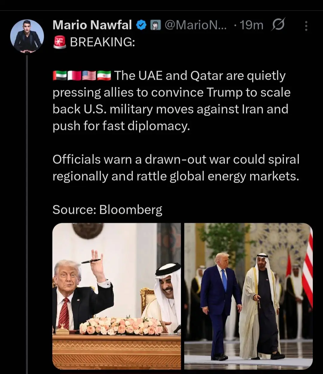 A Bloomberg szerint az Egyesült Arab Emírségek és Katar csendben nyomást gyakorol szövetségeseire, hogy győzzék meg Trumpot az Irán elleni amerikai katonai lépések visszafogására, és sürgősen ösztönözzék a diplomáciát. A tisztviselők arra figyelmeztetnek, hogy egy elhúzódó háború kiterjedhet a régióra, és megrázhatja a globális energiapiacokat.
