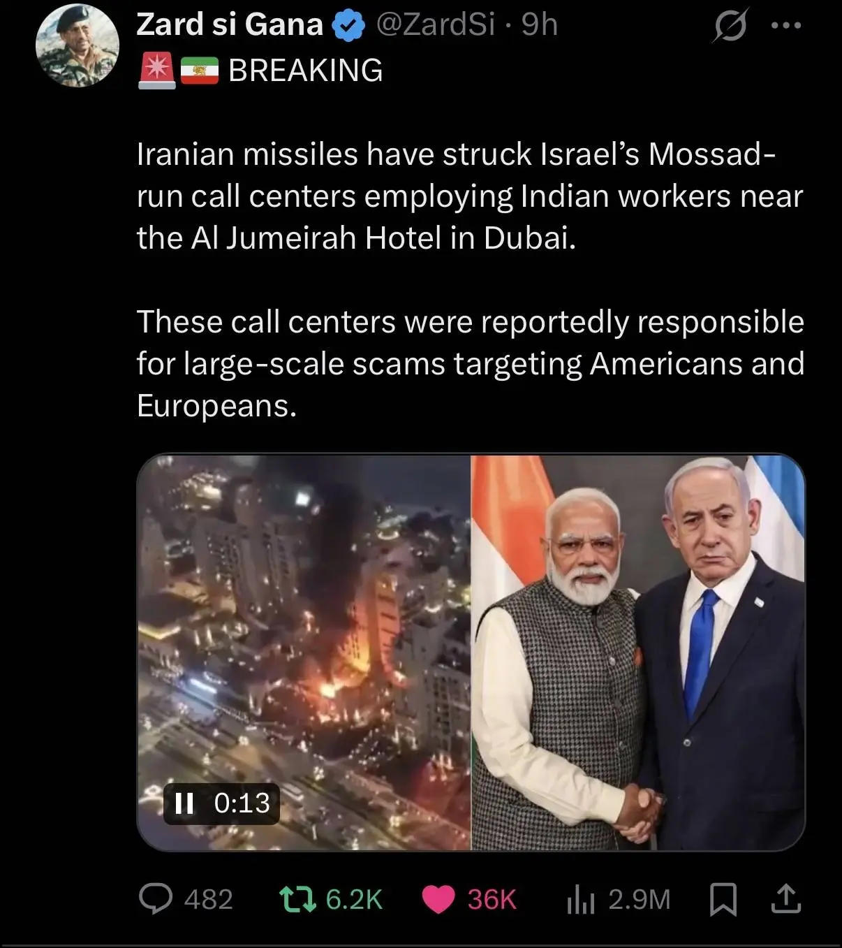 Az iráni rakéták eltalálták a Moszad egyik indiaiakat alkalmazó telefonos ügyfélszolgálatát a dubai Al-Dzsumejra szállodában. Ezek a hívásközpontok állítólag amerikaiakat és európaiakat célzó nagyszabású átveréseket folytattak.