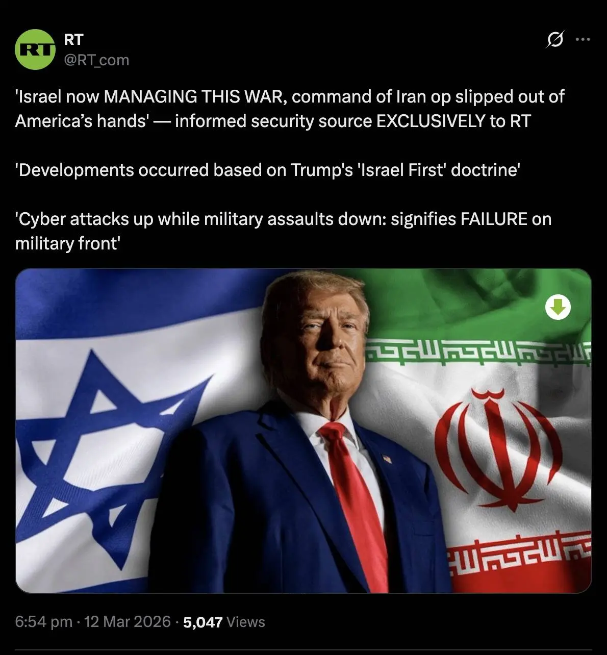 Trump homályosan érzi, hogy zsákutcában van, és az elmúlt 48 órában próbált győzelmet hirdetni, hogy valahogy kievickéljen belőle. Igyekszik megszerezni az irániak hallgatólagos beleegyezését ahhoz, hogy „maradjanak ennyiben”, akárcsak 2025 júniusában, de az irániak megértették, hogy Trump Netanjahu bábja, és csak időt akar nyerni. Iránnak egyáltalán nem áll érdekében az ellenségeskedés szünetelése, ezáltal megengedve az USA-nak, hogy újjászerveződjön és később újra támadjon. Mivel Irán a kezdeményező, emeli a tétet, és semmi oka lemondani erről a pozícióról. Az új vezetője világosan kitűzte a célt, amely nem más, mint az amerikai hadsereg kiűzése a Közel-Keletről, az Irán-ellenes szankciók megszüntetése és jóvátétel fizetése az eddigi összes károkozásért.