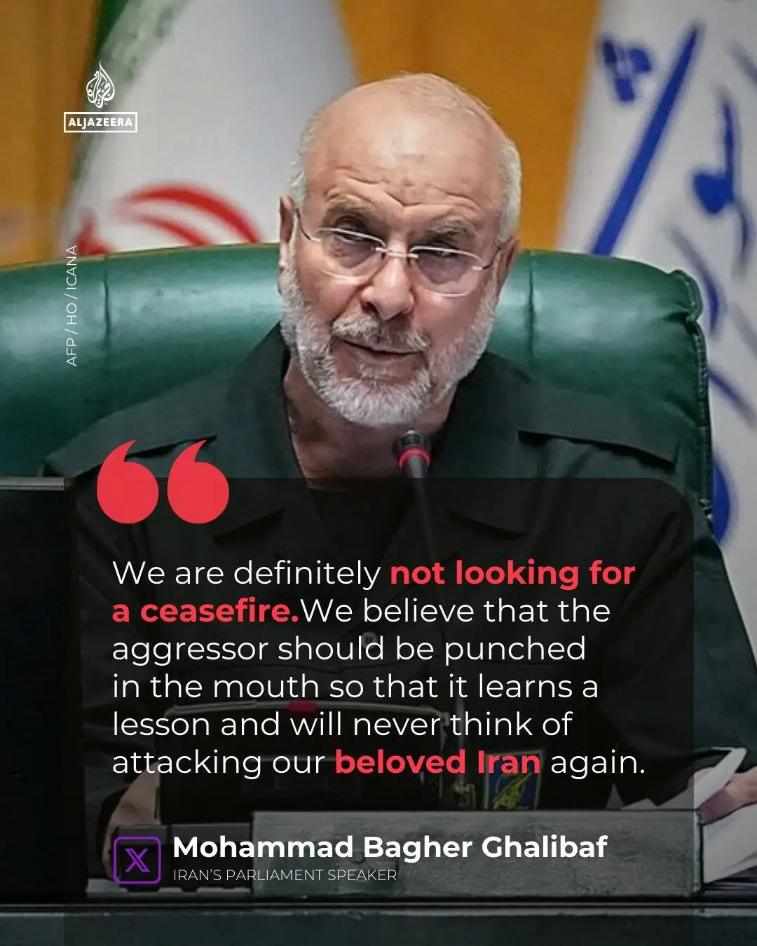 Ali Laridzsáni, az iráni nemzetbiztonsági tanács vezetője, a rezsim szürke eminenciása: „Ma éjjel ománi közvetítőkön keresztül üzeneteket kaptunk az amerikai elnöktől, azt kérve, hogy tárgyaljunk a tűzszünetről. A válaszunk az, hogy nem fogadunk el semmilyen tárgyalásokat, amíg az Izraelnek nevezett entitás létezik.”7