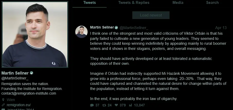Martin Sellner, az Osztrák Identitárius Mozgalom vezetője, a pángermán Neue Rechte kulcsfigurája, a remigrációért kardoskodó európai mozgalom aktivistája: