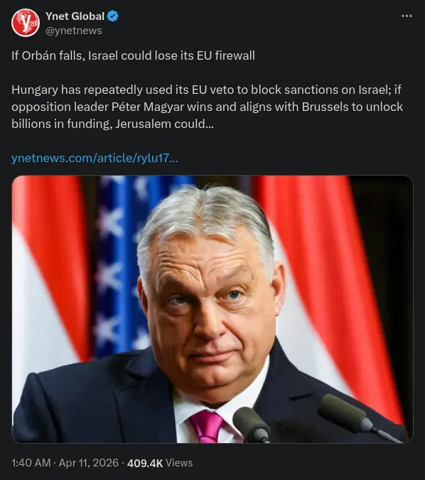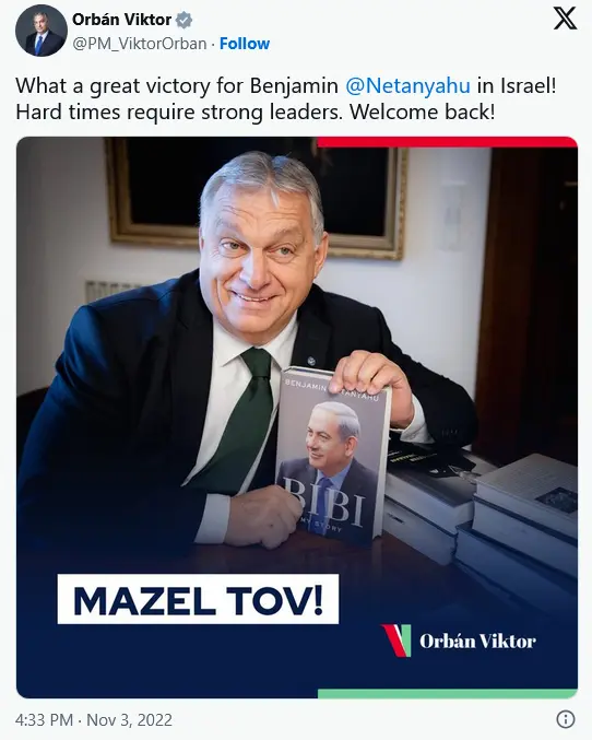 „Ami Orbán próbálkozását illeti, hogy Netanjahu és a washingtoni zsidók segítségével hatalmon maradjon, úgy tűnik, ez veszélybe került. Nem ejtenék egyetlen könnycseppet sem ennek a fickónak a politikai hulláján, ha a halálát megerősítik. Netanjahu könyvének a népszerűsítése és a washingtoni bűnözőkkel való szövetség között semmit sem lehetett megmenteni.