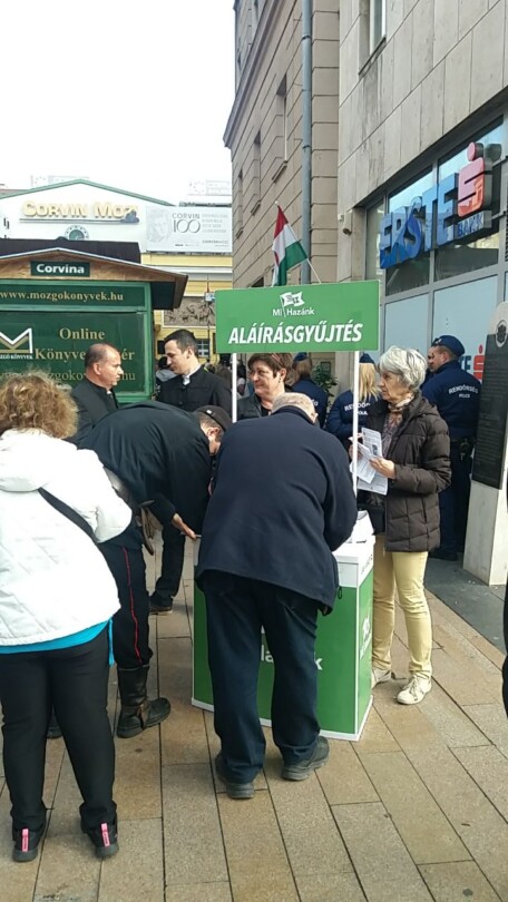 14:40 Bő húsz perc van még hátra a kezdésig, de már szép számmal gyűlnek a résztvevők. Vékony Csongor, a Mi Hazánk budapesti elnökének vezényletével aláíróstanddal is kitelepült a párt. Az érdeklődők egy aláírással tiltakozhatnak a rezsimegszorítások ellen, vagy támogathatják, hogy hazánk maradjon ki a gazdasági háborúból is.