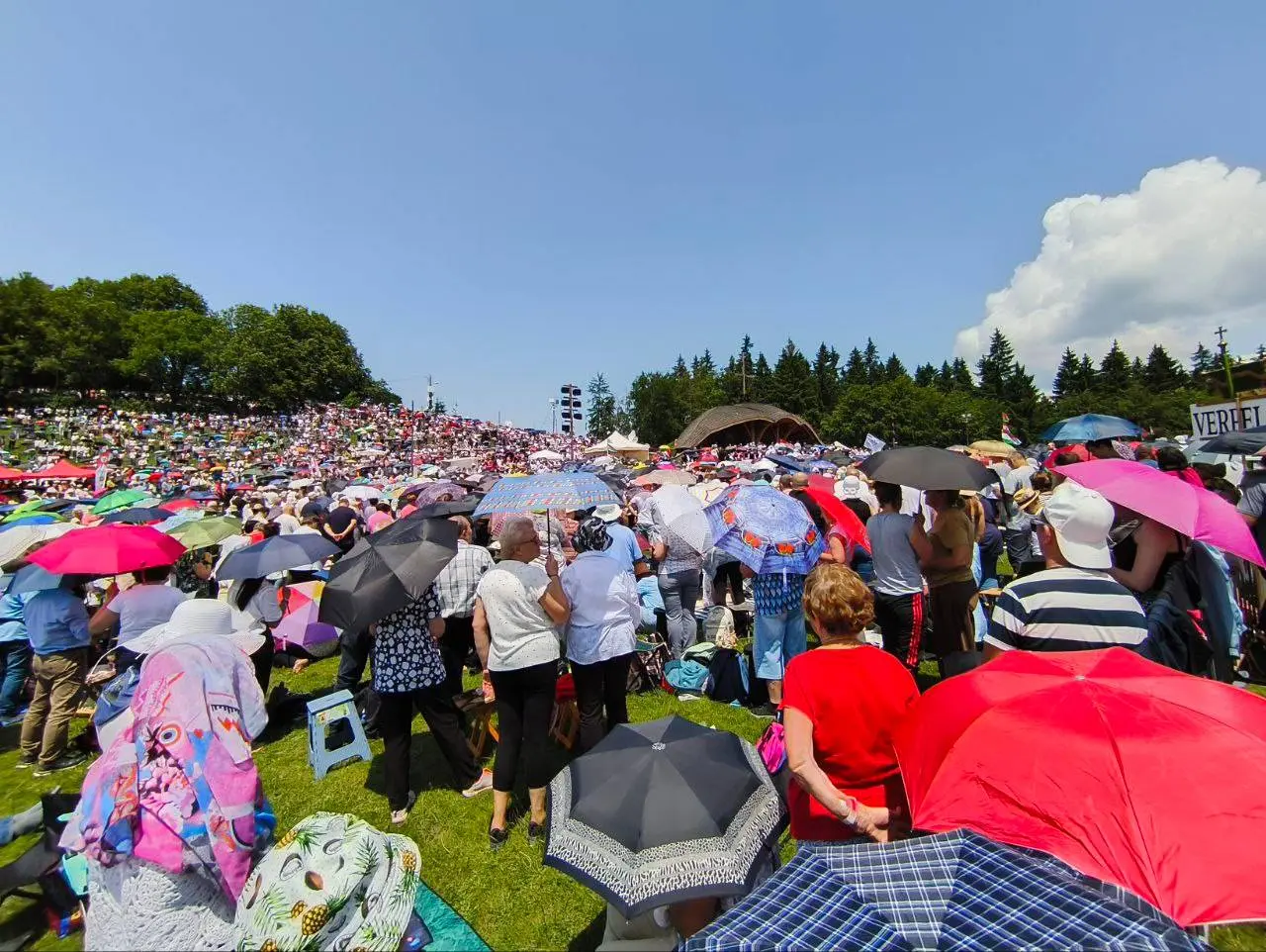 Körbenézve fentről aztán ismét a külvilág ragadhatta magával a résztvevőket. Több százezer magyar, több százezer ember mindenfelé, sokan a fák árnyékában keresve menedéket a tűző nap sugaraitól. A hármashalmot mintázó oltár mögött álltam hosszú percekig, miközben a prédikációt hallgattam. „Igent mondani a szeretetre, igent mondani az életre” – mondta György Alfréd kamilliánus szerzetes szentbeszédében.