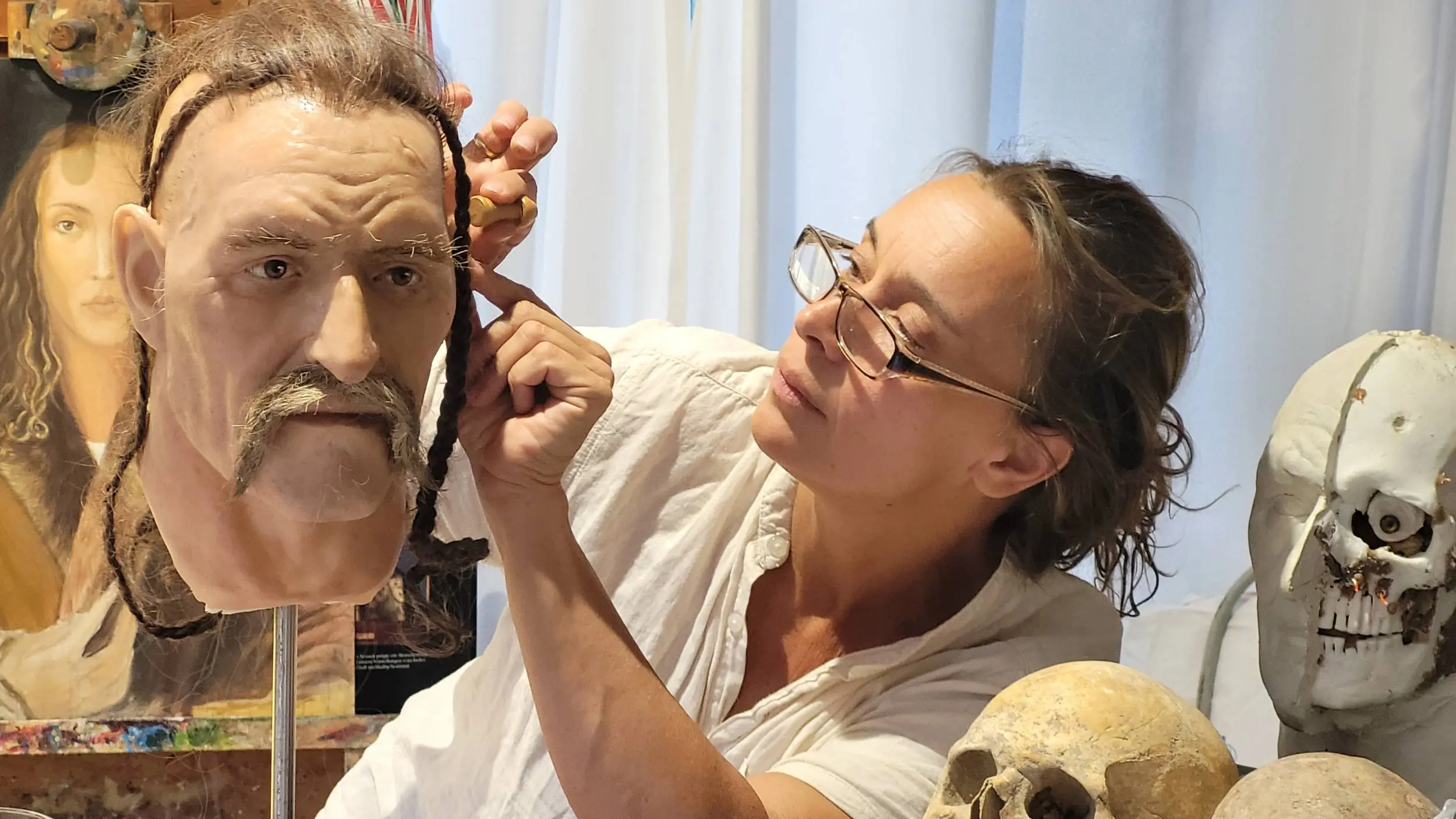 Ezután kezdem a különböző anyagokat – méhviasz, plasztilin, gipsz, agyag, többféle szilikon, kétkomponensű szilárduló anyagok – használva elkészíteni a rekonstrukciót. A megfelelő helyre beillesztem a műszemet – ezeket Herceg Zsuzsa restaurátor készíti el számomra –, minden koponyához külön speciális szemet kérek. Megmondom, hogy mekkora legyen a szemgolyóméret, az íriszméret, a szemnek a színe. De a hajat vagy a szakállat már mindenképpen emberi hajból, vagy szakállból kell megoldanom. Próbáltunk különböző szintetikus anyagokat ezek pótlására, de egyikkel sem tudtuk pótolni a szőrzeteket, semmi nem adott olyan hatást, mint a valódi, eredeti haj, és szakáll.