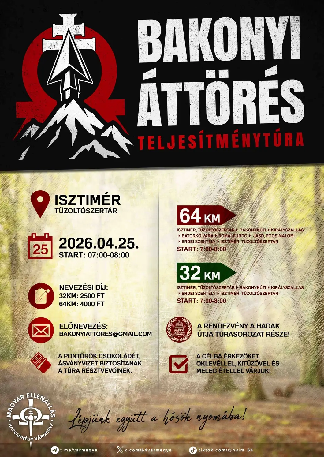 A túra Isztimérről indul, ahonnan a résztvevők két táv közül választhatnak. A 64 kilométeres útvonal a Hadak Útja-túrasorozat leghosszabb túrája, amely valódi próbatételt jelent az indulók számára, míg a 32 kilométeres táv egy rövidebb, de szintén komoly kihívást kínál a Bakony erdőiben.